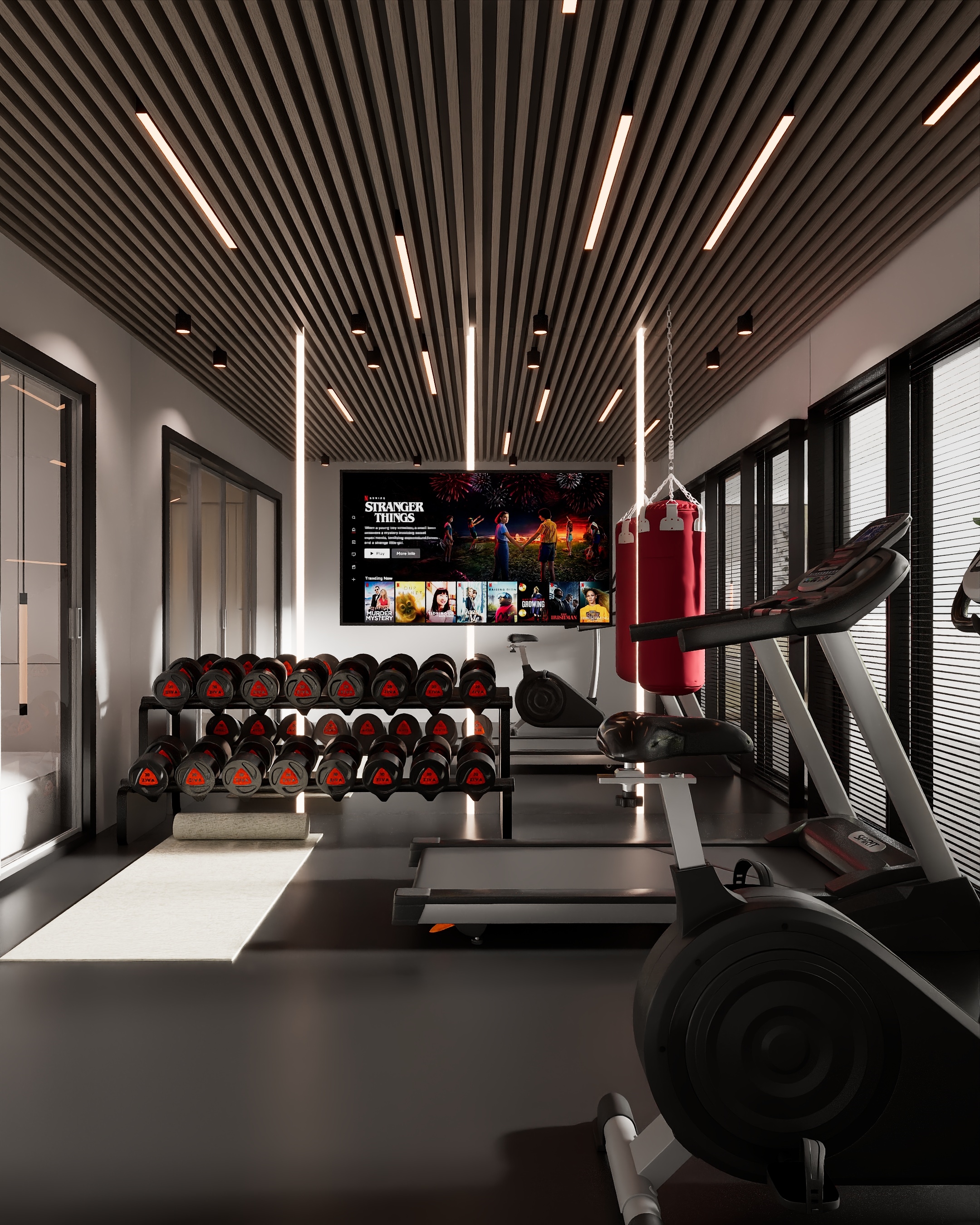The gym and wellness spaces introduce a more robust material expression, combining darker flooring, timber slatted ceilings and integrated lighting to create a focused yet refined atmosphere. Equipment is carefully arranged to maintain visual order and spatial clarity, ensuring the space feels considered rather than purely functional.