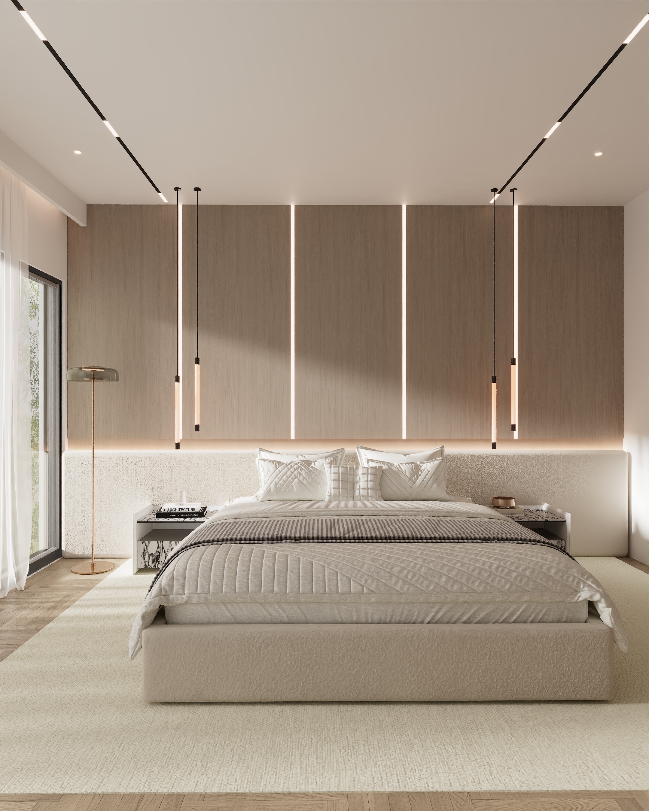 Private areas are designed as individual retreats while remaining aligned with the overall design language. Bedrooms are calm and understated, featuring bespoke headboards, integrated media walls and warm timber finishes. Lighting is layered and indirect, enhancing comfort and relaxation. Bathrooms adopt a spa like quality, using stone surfaces, concealed storage and warm accent lighting to create serene, tactile environments.
