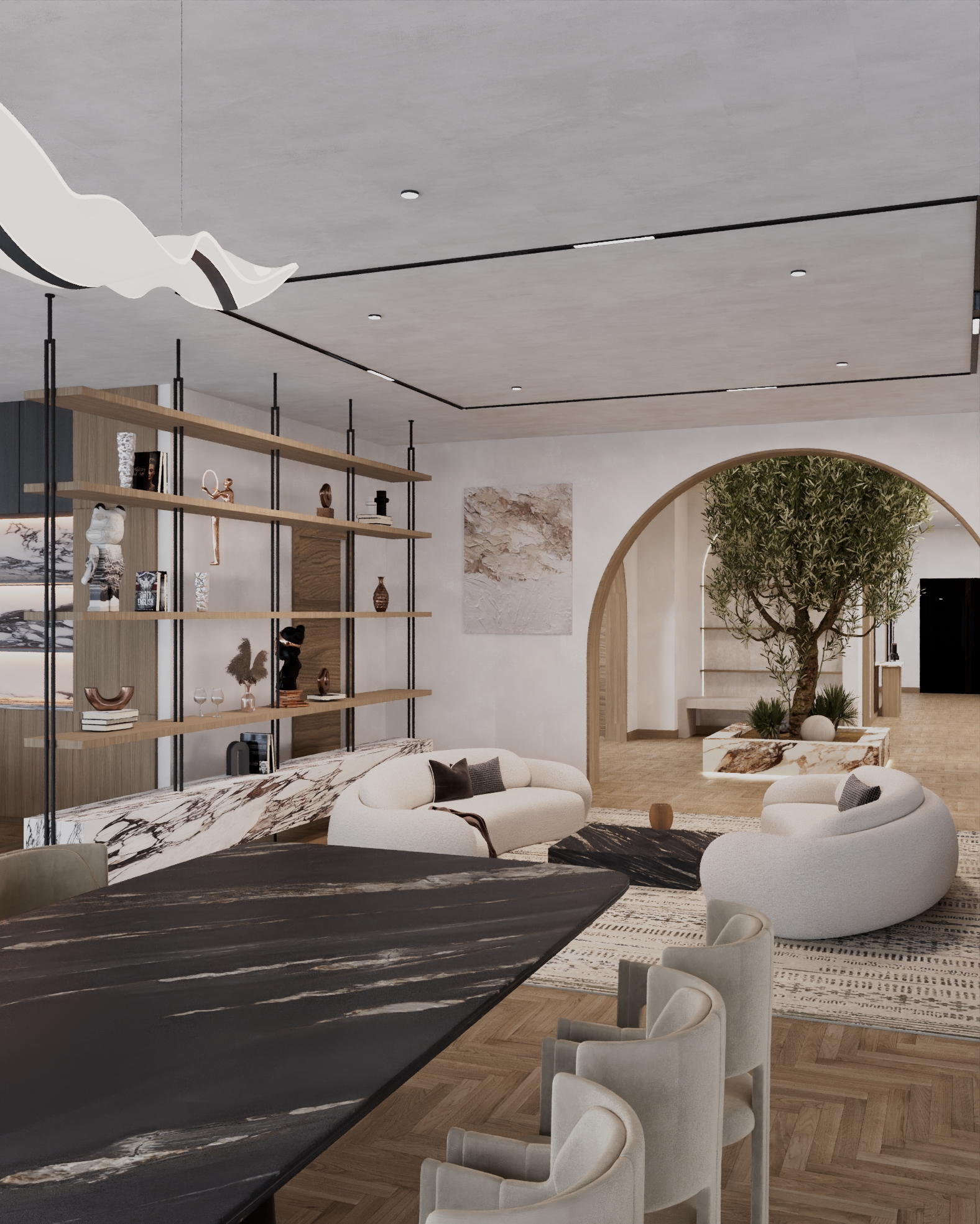 • Bespoke architectural shelving and media walls defining open plan living spaces