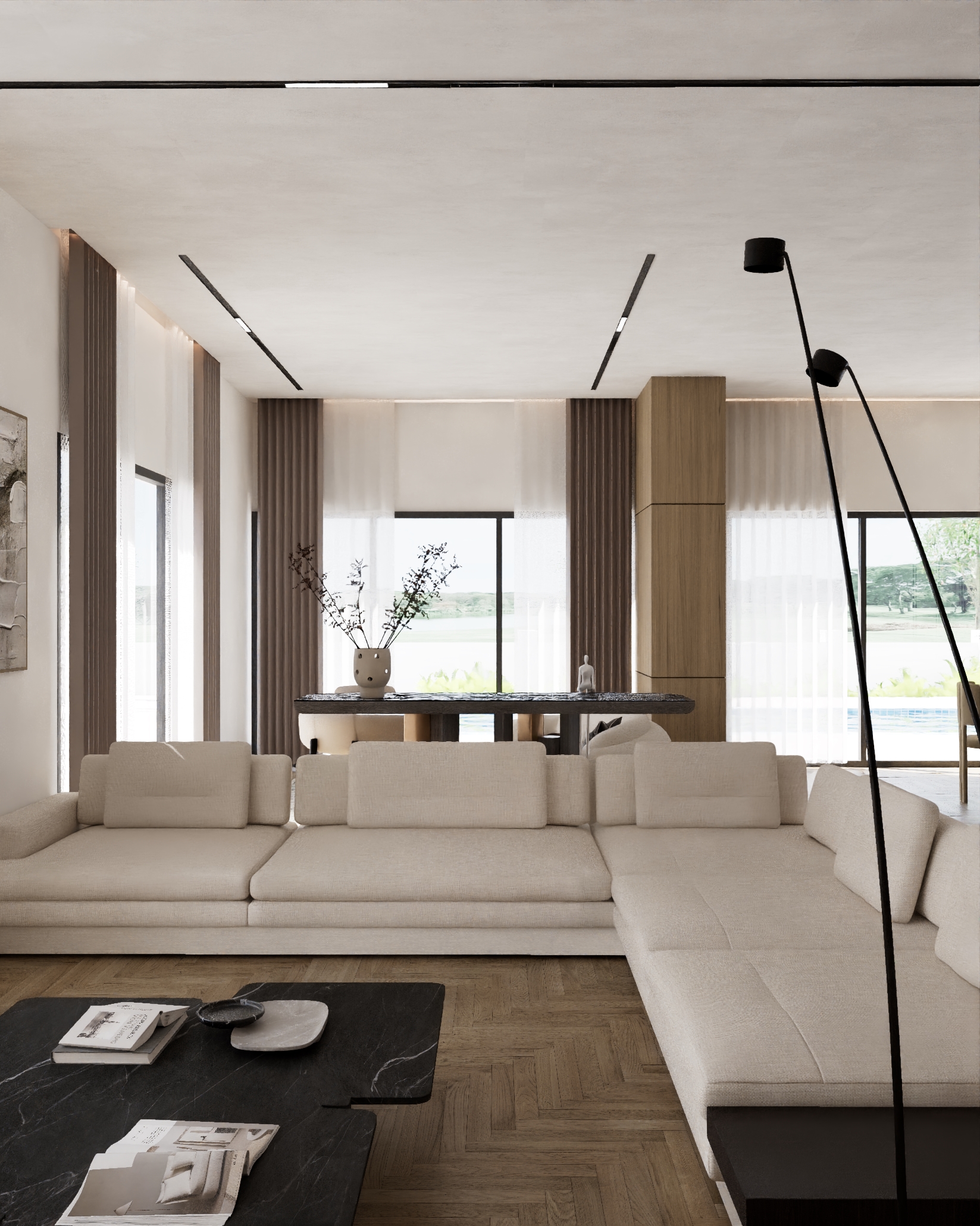 The overall design language is grounded in a restrained palette of natural stone, warm timber and soft neutral tones, allowing form, proportion and light to take precedence. The main living spaces are open yet carefully zoned, using architectural gestures such as framed ceiling recesses, integrated shelving systems and subtle changes in material to define function without interrupting flow. Herringbone timber flooring runs throughout, reinforcing continuity and craftsmanship across the villa.