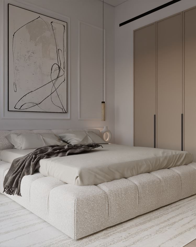 The interior design is rooted in a restrained palette of warm neutrals, layered textures and carefully controlled lighting to create spaces that feel both grounded and elegant. Bedrooms are conceived as serene retreats, with upholstered bed forms, sculpted headboards and integrated lighting used to soften scale and enhance comfort. Vertical wall articulation and subtle joinery detailing add depth without visual noise, while pendant and concealed lighting introduce warmth and intimacy.